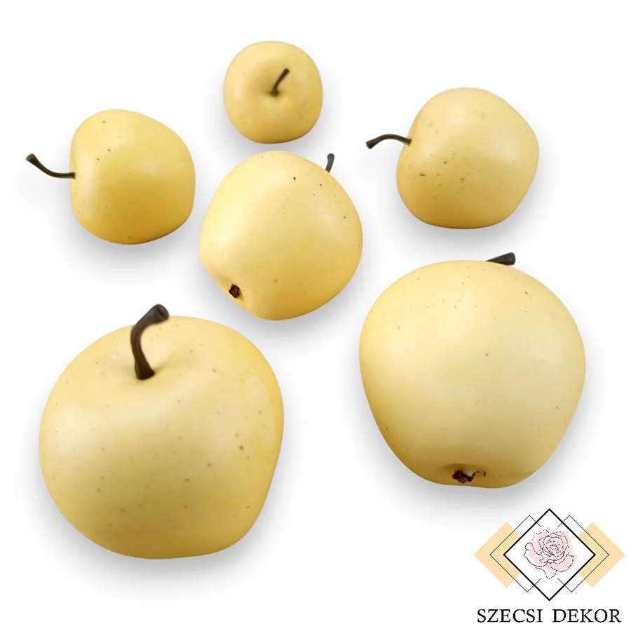 Dekorációs alma csomag kemény, hungarocell anyagból élethű, vastag festékrétegben, celofánban. Alakjuk enyhén eltérő, tapintásuk viaszos, felületük sima, közepesen fényes. Kialakításának köszönhetően önmagában is megáll, az alját sötétbarna darálék zárja le. Szára részletes, sötétbarna műanyagból készült.
