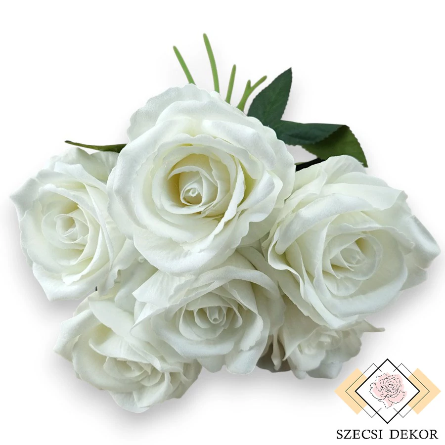 Élethű, prémium minőségű bársony anyagból készült rózsa köteg. Feje nagyméretű, tömött, dombornyomott selyem leveleinek festése aprólékos.
