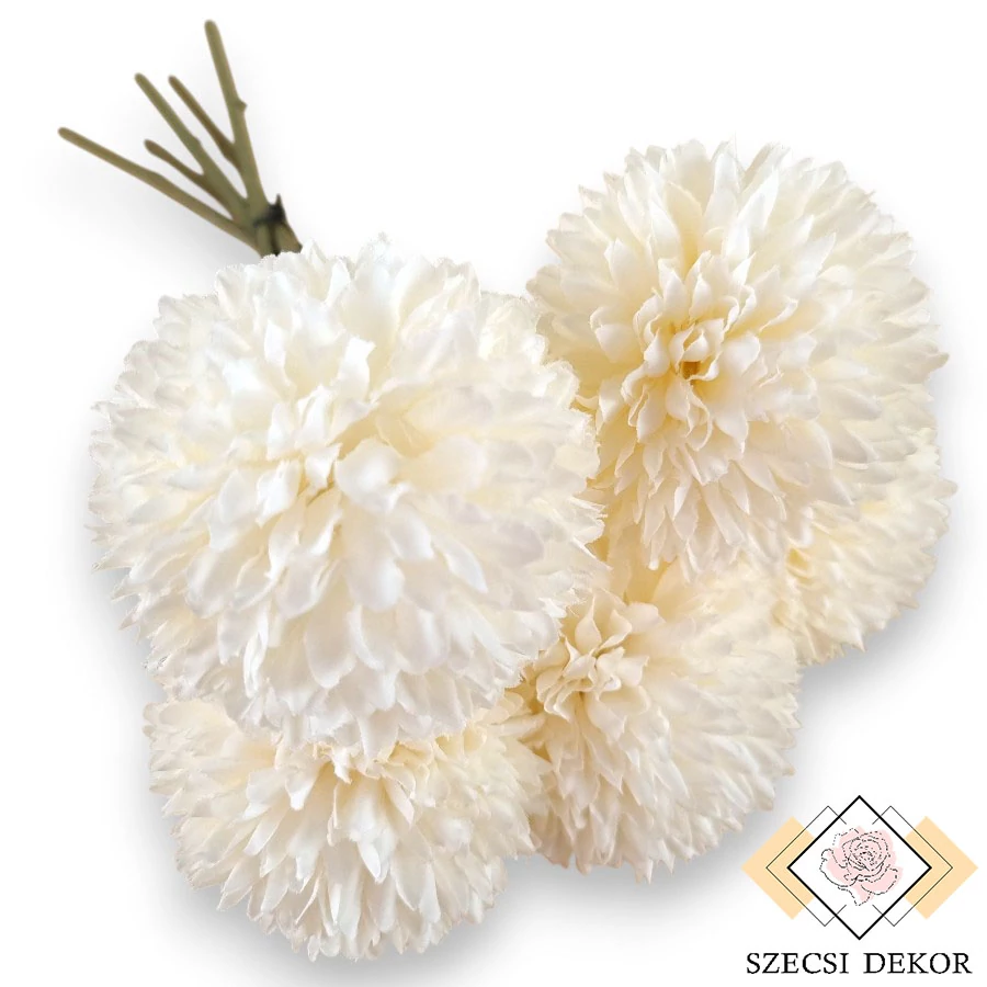 Selyem anyagból készült, gömbös virágzatú közepes méretű allium köteg levelek nélkül. Szinte sima felületű, sötét kekizöld színű szára végig merevített, egyenletesen irdalt. A fejek legfelül helyezkednek el, erősen rögzítettek, alulról keskeny, ritkás műanyag csészelevelek tartják. Rögzített virágfejei a krizantémhoz nagyon hasonlítanak, enyhén öblös, kerekített végű, szálas szirmocskákból állnak amelyek sűrű rétegeben fedik egymást. Porzót nem tartalmaz, több ponton opálos műanyag abroncsok gondoskodnak a tartásról.