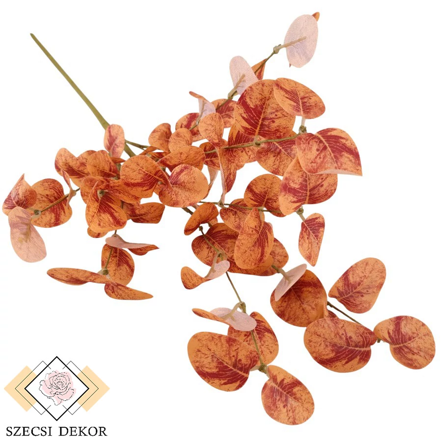 Közepes méretű, őszi színvilággal rendelkező eukaliptusz ág selyem levelekkel. Mérsékelten formázható szára kekizöld krepp papaírral körbetekert, 3 felé ágazik. Minden ágnak 3 db, végig merevített leveles szála van, fejenként 4 db tővel. Levelei párosával, egymással szemben helyezkednek el, a tövek magassága rögzített. Alakjuk vesés, szélük ép, erezetük változatosan festett, színátmenetesek.