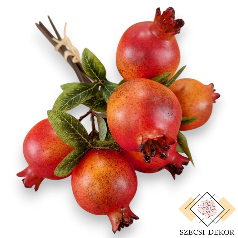 Élethű gyümölcsökkel rendelkező gránátalma köteg selyem levelekkel, raffiával összekötve. Merevített szára barna színű, bőrszerű tapintású, sima felületű gumicsőbe burkolt. Legfelül kétfelé ágazik, melegbarna, műanyag ágai merevítetlenek. Minden szál 2 db termést és 3 db leveles tövet tartalmaz. Leszedhető leveles tövei 3 db, hosszúkás, ép szélű, hegyesedő levélből áll. Felülete csak enyhén fényes, durva szövésű, vastag anyagból készültek. Erezetük élethűen festettek, a hátoldali merevítés átlátszik. A termések alapja hungarocell és kemény, vastag festékréteggel rendelkeznek, kissé fényesek. Festésük aprólékos, változatos, felületük sima, egyenletes. A termések kerekdedek, tetejükön a jellegzetes koronával. Az egy vékony, műanyag tölcsérből készült, szélei hasadtak, szétnyílóak. középen hosszú, szintén műanyag, gombosfejű porzószálak találhatóak, amik festett, ragasztott darálékkal vannak díszítve.