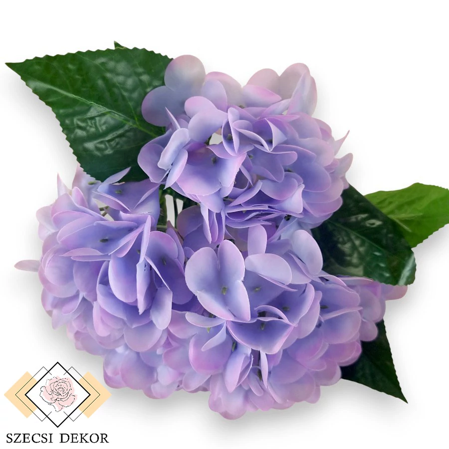 Élethű tapintású, prémium hortenzia csokor vékony, gumi szirmokkal és kidolgozott levelekkel. Vastag, forrasztott szárának felülete hullámos csíkokban barázdált. Szálai végig merevítettek, a középső kivételével mindegyik tartalmaz egy állítható magasságú, páros leveles tövet. A fényes levelek alakja elliptikus, szélük fűrészes, tapintásuk csúszós. Erezetük szerteágazó, nyomtatott, a sejtek pedig részletesen dombornyomottak. Legfelül található az ernyős virágzat, körben, 2 sorban helyezkednek el: lent 6x-, fent 4x3 virág helyezkedik el. Szirmai 4 részből állnak, kerekek, porzója pusztán az akasztója hegye. Gumi szirmainak felülete majdnem sima, erezetük néhol, enyhén dombornyomott.