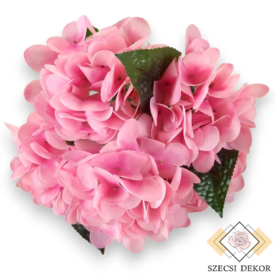 Élethű tapintású, prémium hortenzia csokor vékony, gumi szirmokkal és kidolgozott levelekkel. Vastag, forrasztott szárának felülete hullámos csíkokban barázdált. Szálai végig merevítettek, a középső kivételével mindegyik tartalmaz egy állítható magasságú, páros leveles tövet. A fényes levelek alakja elliptikus, szélük fűrészes, tapintásuk csúszós. Erezetük szerteágazó, nyomtatott, a sejtek pedig részletesen dombornyomottak. Legfelül található az ernyős virágzat, körben, 2 sorban helyezkednek el: lent 6x-, fent 4x3 virág helyezkedik el. Szirmai 4 részből állnak, kerekek, porzója pusztán az akasztója hegye. Gumi szirmainak felülete majdnem sima, erezetük néhol, enyhén dombornyomott.