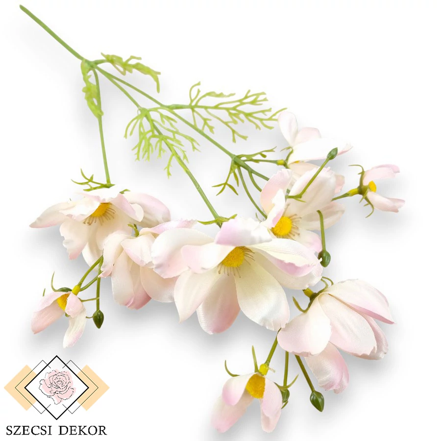 Dús, nyíló virágzatú, kisméretű cosmos bipinnatus szál selyemből, bokros levélzettel. Vékony, merevített szára sima felületű, több ponton irdalt, háromfelé ágazik. Gazos-szálas levelei többszörösen elágazóak, műanyagból készültek, végük hegyes, leszedhetők. Minden szál tartalmaz egy nyílt, 1 nyíló és egy kicsi fejet, valamint 2 db tömör, barázdált bimbót. Szirmai visszás tojásdad alakúak, szélük ép, végük fűrészes, szélük - többnyire - hátrahajló. Vastag anyagból készültek, felületük közepesen fényes. Erezetük dombornyomott, középen domború, kisebb méretű termőtáj látható, amely sárga, fényes szálakkal díszített. Ezt opálosan barna, szétálló, gömbösvégű porzószálak veszik körbe. A fejek is leszedhetőek.