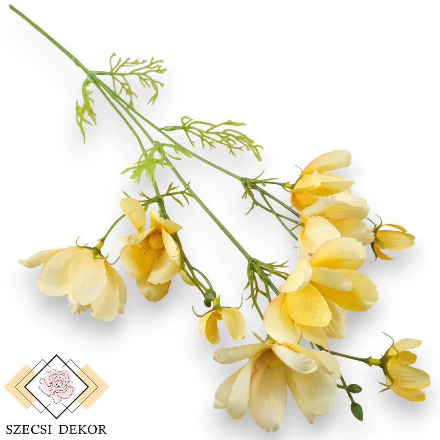 Dús, nyíló virágzatú, kisméretű cosmos bipinnatus szál selyemből, bokros levélzettel. Vékony, merevített szára sima felületű, több ponton irdalt, háromfelé ágazik. Gazos-szálas levelei többszörösen elágazóak, műanyagból készültek, végük hegyes, leszedhetők. Minden szál tartalmaz egy nyílt, 1 nyíló és egy kicsi fejet, valamint 2 db tömör, barázdált bimbót. Szirmai visszás tojásdad alakúak, szélük ép, végük fűrészes, szélük - többnyire - hátrahajló. Vastag anyagból készültek, felületük közepesen fényes. Erezetük dombornyomott, középen domború, kisebb méretű termőtáj látható, amely sárga, fényes szálakkal díszített. Ezt opálosan barna, szétálló, gömbösvégű porzószálak veszik körbe. A fejek is leszedhetőek.