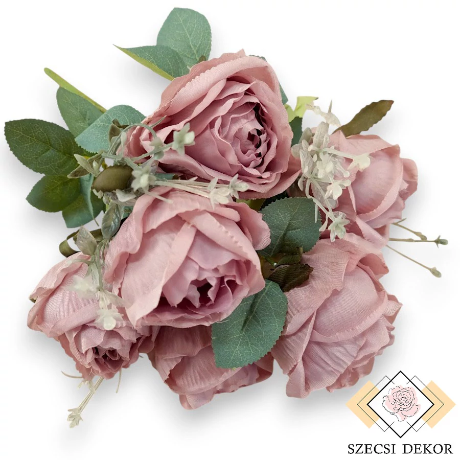 Nagyméretű, zárt virágokkal rendelkező rosa chinensis bokros csokor levelekkel és mű zölddel. Vastagabb, forrasztott szára pontokban barázdált, sűrűn irdalt. Minden szál tartalmaz egy állítható magasságú, 2x3 darabból álló leveles tövet. Levelei elliptikusak, szélük fűrészes felületük matt. Színük sötétzöld, erezetük és sejtjeik részletesen festettek, valamint a hátoldali merevítés is átüt. További 3 szál tartalmaz egy három részből álló, szintén állítható elhelyezkedésű mű zöld kiegészítőt. Ezek opálos cementzöld színűek, nyújtottan elliptikus, ritkásan elhelyezkedő, ép szélű, dombornyomott levelekből és a tetejükön lévő, kissé lapított bogyókból állnak. Szirmai vastag anyagból készültek, kerekdedek, de aszimmetrikusak. Szélük ép, fodros, erezetük erősen dombornyomott. A középsők a legnagyobbak, szélük néhol hátrahajló, középen hungarocell kúp gondoskodik a tartásról.