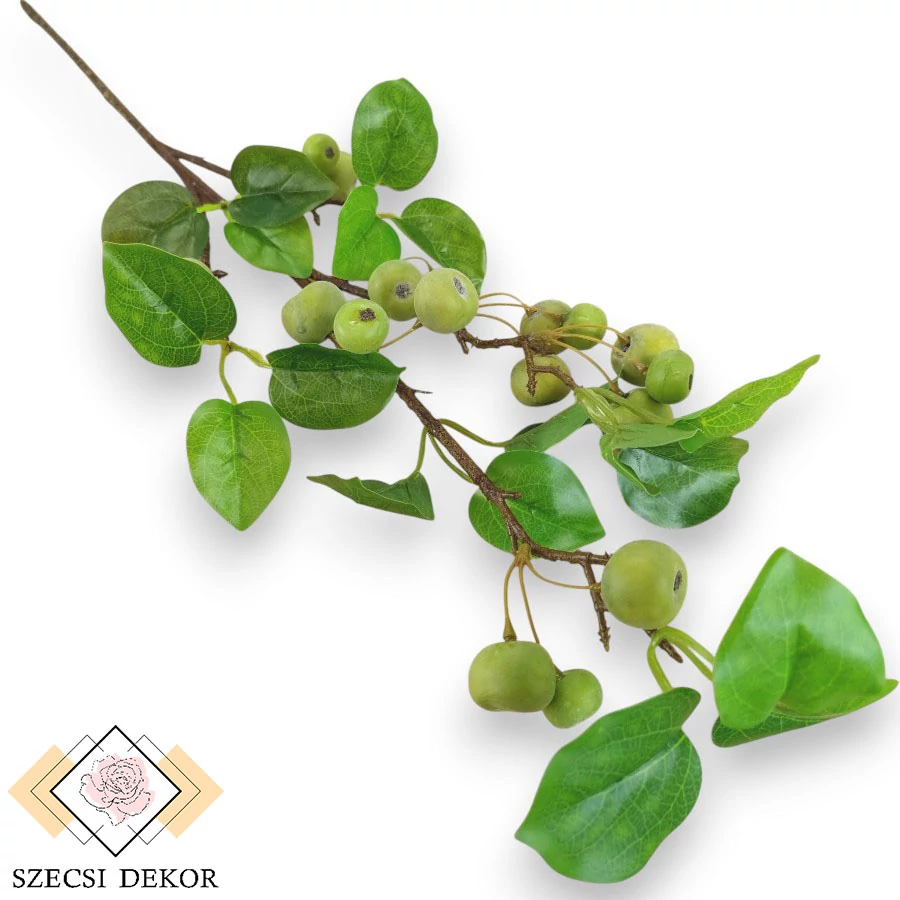 Élethű tapintású pyrus pyraster ág bevonatos levelekkel, közepes termésekkel. Merevített, könnyen formázható szára érdes felületű, változatosan irdalt, sötétbarna színű, hamvas festéssel. Többfelé ágazik, azok is barnák és érdesek, de már merevítetlenek. Leszedhető leveles tövei 3 részből állnak. Alakjuk enyhén szíves, szélük ép, végük hegyesedő Felületük a bevonatnak köszönhetően közepesen fényes, sima, élethű tapintású. Erezetük és sejtjeik részletesen festettek. Terméses tövei szintén eltávolíthatóak, és 3 db eltérő méretű bogyót tartalmaznak. Alapjuk hungarocell, kissé oválisak, fixen ragasztottak, közepük nyomott, darálékkal díszített. Felületük sima, matt, hamvas borítással, festésük foltokban átmenetes.