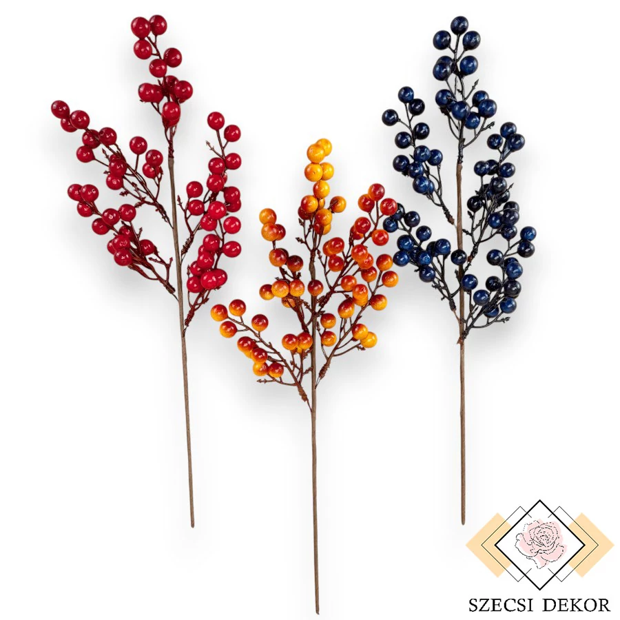 Ritkás termésű, fényes-bevonatos, élethű tapintásúmadárbirs ág bogyókkal, levelek nélkül. Vékony, merevített szára barna színű krepp papírral körbetekert, könnyen formázható. Három dróttal fixen rögzített terméses tővel rendelkezik. Ezek merevítetlenek, vastagon festettek, többszörösen elágazóak. Bogyói ragasztottak, festésük erős színű, felületük közepesen fényes, csúszós. Méretük nagyjából azonos, némelyiken látszik a virágcsonk.