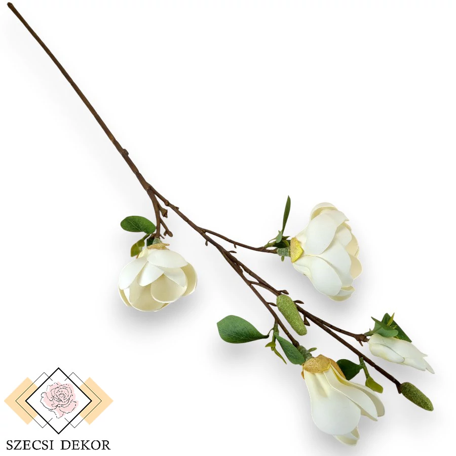 Nyíló, teltvirágú, kerek fejű magnólia ág hungarocell és polifoam bimbókkal és levelekkel. Barna színű, foltokkal tarkított, merevített szára részletesen, kacskaringósan barázdált, irdalt. Két fő ága van, a középső vágott. Mellékágai tetejét, a fejek illetve na gyméretű bimbók zárják le. Szintén merevítettek, barázdáltak és irdaltak, illetve bimbókkal, rügyekkel sűrűn tűzdeltek. Selyem levelei csoportokban helyezkednek el, a tövek leszedhetőek. Elliptikus alakúak, erezetük részletesen festett, a legkisebb gumiból készültek. Bimbóinak alapja hungarocell, zöld színű, fényes szálakkal vannak bevonva. Fejei eltérő méretűek, szirmai kerekdedek, három rétegben fedik egymást, öblösek, szélük ép. Termőtáját lapított, dombornyomott, vörös színű, széles porzószálakból és középen kicsúcsosodó, lefelé hajló műanyag szálakkal díszített, hegyes kúp formájú bibe alkotja.
