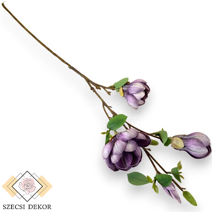 Nyíló, teltvirágú, kerek fejű magnólia ág hungarocell és polifoam bimbókkal és levelekkel. Barna színű, foltokkal tarkított, merevített szára részletesen, kacskaringósan barázdált, irdalt. Két fő ága van, a középső vágott. Mellékágai tetejét, a fejek illetve na gyméretű bimbók zárják le. Szintén merevítettek, barázdáltak és irdaltak, illetve bimbókkal, rügyekkel sűrűn tűzdeltek. Selyem levelei csoportokban helyezkednek el, a tövek leszedhetőek. Elliptikus alakúak, erezetük részletesen festett, a legkisebb gumiból készültek. Bimbóinak alapja hungarocell, zöld színű, fényes szálakkal vannak bevonva. Fejei eltérő méretűek, szirmai kerekdedek, három rétegben fedik egymást, öblösek, szélük ép. Termőtáját lapított, dombornyomott, vörös színű, széles porzószálakból és középen kicsúcsosodó, lefelé hajló műanyag szálakkal díszített, hegyes kúp formájú bibe alkotja.