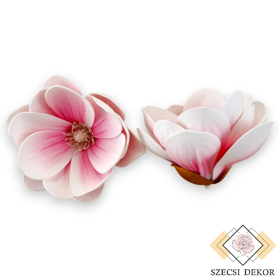 Élethű tapintású habosított polifoam anyagból készült nyílt, tripla szirmú magnólia fejek. Betűzője rövidke, üreges műanyag, csészelevele barnaszínű flokkolt készült, 3 részből áll. Szirmai tojásdad alakúak, öblösek, erezetük formakövető, dombornyomott. Festésük valósághű, részletes, szélük ép. Viszonylag hosszú porzószálai kuszák, gumiból készültek, középen tornyosuló, lefelé kunkorodó nyúlványokkal rendelkező bibéje pedig műanyag.