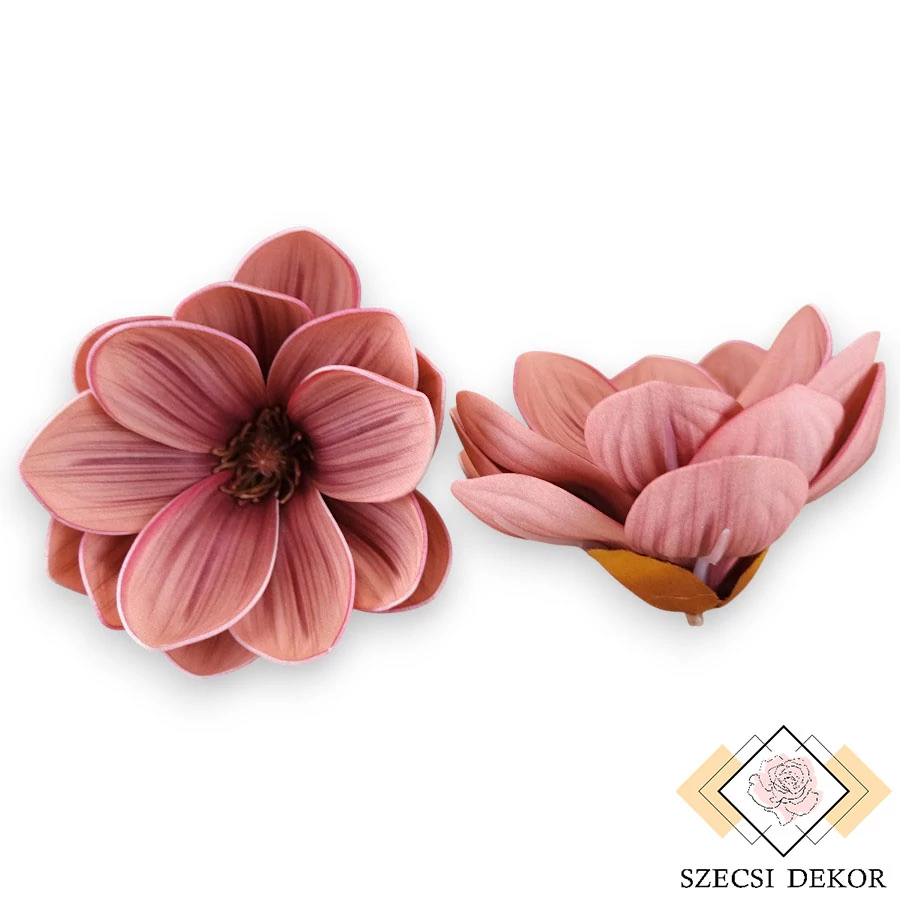 Élethű tapintású habosított polifoam anyagból készült nyílt, tripla szirmú magnólia fejek. Betűzője rövidke, üreges műanyag, csészelevele barnaszínű flokkolt készült, 3 részből áll. Szirmai tojásdad alakúak, öblösek, erezetük formakövető, dombornyomott. Festésük valósághű, részletes, szélük ép. Viszonylag hosszú porzószálai kuszák, gumiból készültek, középen tornyosuló, lefelé kunkorodó nyúlványokkal rendelkező bibéje pedig műanyag.