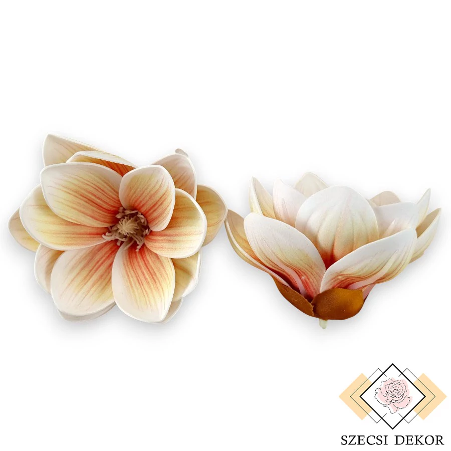 Élethű tapintású habosított polifoam anyagból készült nyílt, tripla szirmú magnólia fejek. Betűzője rövidke, üreges műanyag, csészelevele barnaszínű flokkolt készült, 3 részből áll. Szirmai tojásdad alakúak, öblösek, erezetük formakövető, dombornyomott. Festésük valósághű, részletes, szélük ép. Viszonylag hosszú porzószálai kuszák, gumiból készültek, középen tornyosuló, lefelé kunkorodó nyúlványokkal rendelkező bibéje pedig műanyag.
