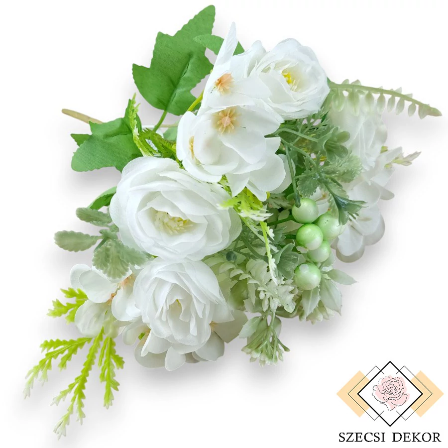 Vegyes selyem csokor nyíló molyhos rózsa fejekkel és hunyorral mű zöld kiegészítőkkel, bogyókkal. Forrasztott, sárgászöld szára sima felületű, irdalt. A középső szál kivételével mindegyik tartalmaz egy állítható magasságú levélhármast. Ezek tenyeresen hasadtak, szélük fűrészes, felületük matt, világoszöld színűek. Három szálon vannak a hunyor tövek, alattuk állítható magasságú, fehér tetejű opálzöld csipkeharaszttal. Kövérkés szirmaiból ötfelé ágaznak, középen barackszínű porzókkal és bibével. További három 2 db molyhos rózsa fejjel és sötétzöld-fehér színű páfrányos-fodros levélkés-kisvirágos mű zöldekkel rendelkezik. A rózsák szirmainak széle hátrahajló, kerekek, sűrűn fedik egymást. Középen, tömötten kerekvégű porzószálak láthatóak. A középső szálon 9 db festett, hungarocell golyó valamint sötétzöld-fehér tüskés levelű, bogyós-bimbós mű zöld kapott helyet.