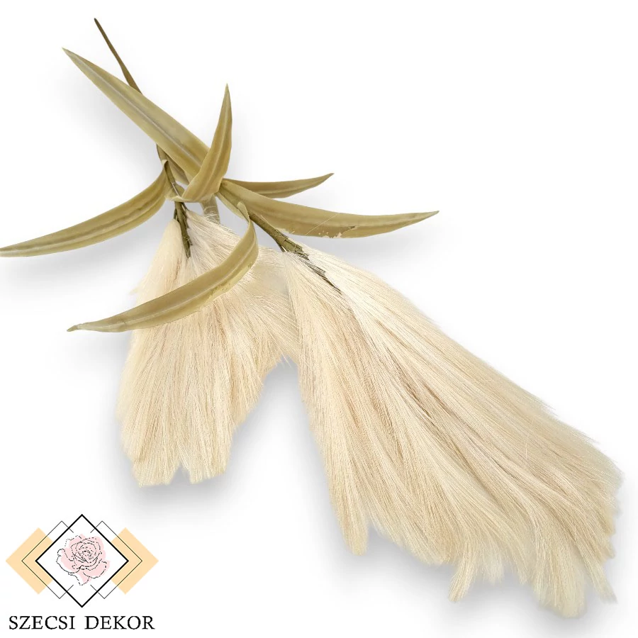Hosszú, dús, szaténszálas pampafű. Szára barna krepp papírral bevont, 2 felé ágazik. Mindkét szálon található 3 db, végig merevített, matt selyemből készült vastag levél.