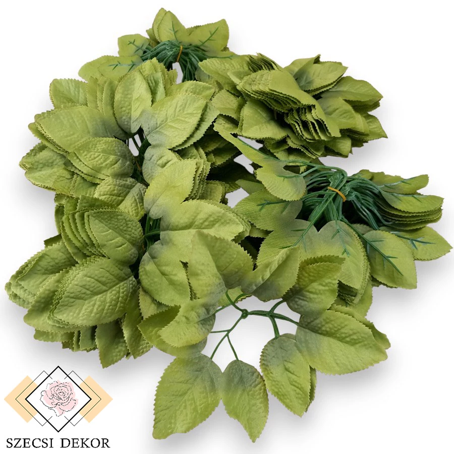 Szaténfényű, részletesen kidolgozott selyem rózsalevél tő csomag visszazárható tasakban. Műanyag szára méregzöld, merevítetlen, felülete sima. Két részből áll egyenként 3, nem teljesen szétvágott levelet tartalmaz. Alakjuk elliptikus, szélük fűrészes, felületük fényes. Anyaguk vastag, erezetük, sejtjeik dombornyomottak.