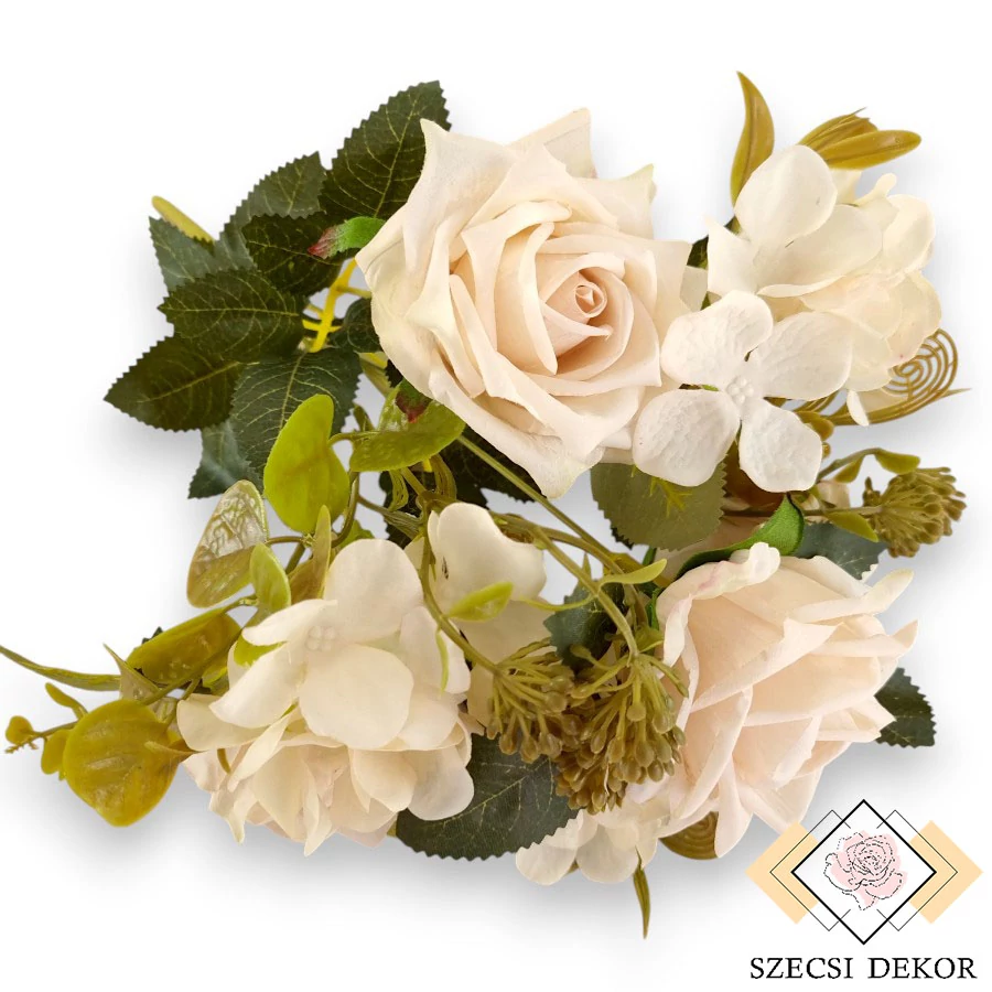 Tearózsa vegyes csokor hortenziával, közepes virágokkal, mű zöld kiegészítőkkel és levelekkel. Közepes, forrasztott szára csíkokban barázdált, sűrűn irdalt, világoszöld színű. Szálai végig merevítettek, a levelek és kiegészítők magassága állítható. Hét szál tartalmaz egy 2x3 darabból álló leveles tövet. Ezek tojásdad alakúak, nincsenek teljesen szétvágva. Szélük fűrészes, végük hegyes, erős anyagból készültek, felületük közepesen fényes, sejtjeik és erezetük festettek. Három szál tartalmaz állítható mű zöldeket: az egyik fele hosszúkás, épszélű, hullámos szárú levelekből, másrészt lukacsos-indás-leveles tőből áll. Ugyan ennek a 3 szálnak a tetejét foglalják el az ernyősen elhelyezkedő, közepes méretű, nyílt hortenziák. Kerekded szirmai kissé fodrosak, dombornyomottak, matt felületűek, középen a megszokott 4 pettyes porzó látható. Kettő szál csak kiegészítőt tartalmaz, ami eukaliptuszszerű, pontokban dombornyomott levelekből és gömbszerűen elhelyezkedő, bogyós végű fejből áll. A maradék négyet a nyíló, hegyesszirmú rózsafejek foglalják el. Befelé haladva méretük csökken, szélük keményített, hátrahajló. Matt festékkel vannak bevonva, és enyhén nyomottak. Több rétegekben fedik egymást, középen hungarocell kúp gondoskodik a tartásról.