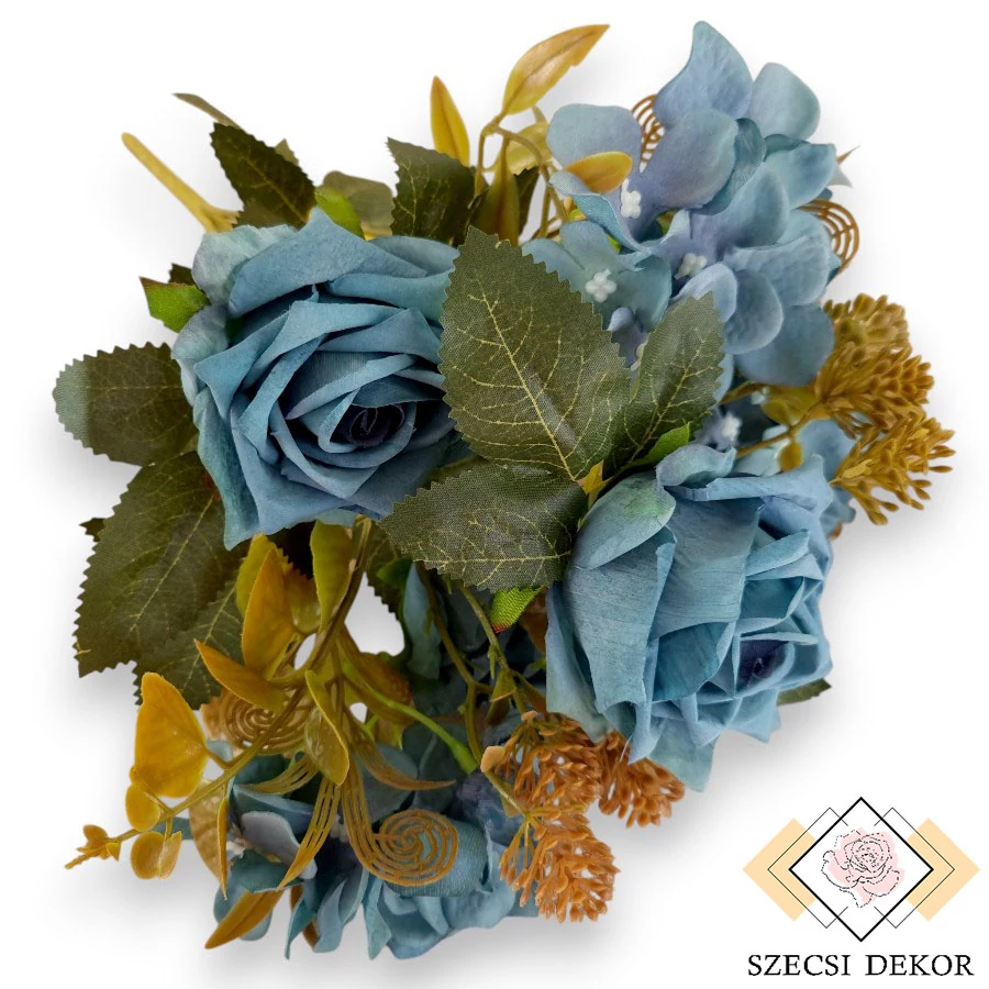 Tearózsa vegyes csokor hortenziával, közepes virágokkal, mű zöld kiegészítőkkel és levelekkel. Közepes, forrasztott szára csíkokban barázdált, sűrűn irdalt, világoszöld színű. Szálai végig merevítettek, a levelek és kiegészítők magassága állítható. Hét szál tartalmaz egy 2x3 darabból álló leveles tövet. Ezek tojásdad alakúak, nincsenek teljesen szétvágva. Szélük fűrészes, végük hegyes, erős anyagból készültek, felületük közepesen fényes, sejtjeik és erezetük festettek. Három szál tartalmaz állítható mű zöldeket: az egyik fele hosszúkás, épszélű, hullámos szárú levelekből, másrészt lukacsos-indás-leveles tőből áll. Ugyan ennek a 3 szálnak a tetejét foglalják el az ernyősen elhelyezkedő, közepes méretű, nyílt hortenziák. Kerekded szirmai kissé fodrosak, dombornyomottak, matt felületűek, középen a megszokott 4 pettyes porzó látható. Kettő szál csak kiegészítőt tartalmaz, ami eukaliptuszszerű, pontokban dombornyomott levelekből és gömbszerűen elhelyezkedő, bogyós végű fejből áll. A maradék négyet a nyíló, hegyesszirmú rózsafejek foglalják el. Befelé haladva méretük csökken, szélük keményített, hátrahajló. Matt festékkel vannak bevonva, és enyhén nyomottak. Több rétegekben fedik egymást, középen hungarocell kúp gondoskodik a tartásról.