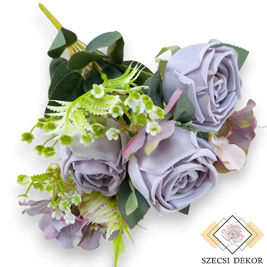 Törzses rózsa vegyes csokor hortenziával, közepes virágokkal, mű zöld kiegészítőkkel és levelekkel. Vastag, forrasztott szára csíkokban barázdált, irdalt, sárgászöld színű. Szálai végig merevítettek, a levelek és kiegészítők magassága állítható. Minden szál tartalmaz egy 3 darabból álló leveles tövet. Ezek tojásdad alakúak, szélük fűrészes, végük hegyes. Erős anyagból készültek, felületük mattfényű, sejtjeik és erezetük festettek. Három szál tartalmaz állítható mű zöldeket: Alul egy fehér-zöld átmenetes, szárnyasan összetett, fogas, ár alakú levelekkel rendelkező páfrány, fölötte pedig egy 2 részes, kör alakban elhelyezkedő, tüskés levelű, apró, kerek virágú, szintén fehér zöld elem található. Ugyan ennek a 3 szálnak a tetejét foglalják el az ernyősen elhelyezkedő, nagyméretű, nyílt hortenziák. Kerekded szirmai kissé fodrosak, erezetük erősebben dombornyomott, középen a megszokott 4 pettyes porzó látható. A maradék négyet a félig nyílt, kehely formájú rózsafejek foglalják el. Tetejük lapított, a szirmok mérete befelé haladva csökken. Szélük hátrahajló, ép, formájuk kerek. Sűrű rétegekben fedik egymást, középen hungarocell kúp gondoskodik a tartásról.