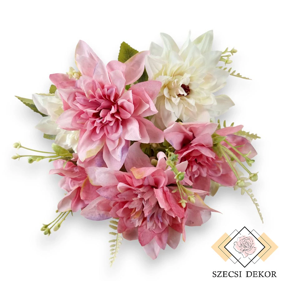 Nagyvirágú tűdália csokor mű zöld kiegészítőkkel és selyem levelekkel. Olajzöld forrasztott szára pontokban barázdált, sűrűn irdalt. A középső kivételével mindegyik szál tartalmaz 1 pár (2x3 darab) rózsalevelet, amelyek nincsenek teljesen szétvágva. Alakjuk elliptikus, szélük fűrészes, erezetük élethűen nyomtatott, magasságuk állítható. Egy szál kivételével mindegyik tartalmaz egy 3 részből álló mű zöld tövet, aminek egyik része egy domborodó erezetű, színátmenetes bordapáfrány. A másik 2 eleme kisvirágos-bimbós, pár db elliptikus, homorú erezetű levélkével. Szirmai kellemes tapintású, közepes szövésű selyemből készültek befelé haladva méretük csökken. Jórészt egymás fölött helyezkednek el a rétegek, középen dúsan szálas porzók ékeskednek. Szirmainak alakja nyélbe keskenyedő, szélük ép, dombornyomottak.