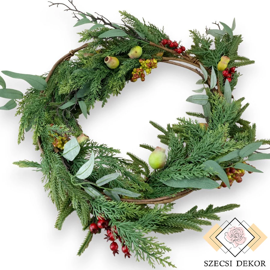 Élethű tapintású, gumi anyagú girland araukáriával, tujával és termésekkel. Szára több, összefonott részből áll, mérsékelten hajlítható, barna krepp papírral bevont. Az elemek a szakaszok végén találhatóak, a közöttük lévő rész csupasz. Összetételük nagyjából azonos: vegyesen tuja és araukária ágak, hosszúkás levelű eukaliptusz selyemből, barna műanyag csupasz ág, zöld-barna vagy vörös bogyók illetve mákra hajazó kisebb-nagyobb termések. A levelek tapintása kellemes, bőrszerű, az araukária tűlevelei rövidebbek, felfelé állnak, azonos méretűek, a tuja elágazó, leveleinek mérete felfelé csökken. AZ eukaliptusz levelek lándzsásak, erezetük részletesen festett. A bogyók szárai merevítetlenek, a zöld-barnák füzér szerűen, összetapadva helyezkednek el, méretük változatos. A vörös bogyók azonos méretűek, erőteljes színűek, tetejükön virágcsonk látható. A mákgubók kemény bevonattal rendelkeznek, színük átmenetes, középen a krátert vörösesbarna darálék díszíti. Mindegyik termés alapja hungarocell.