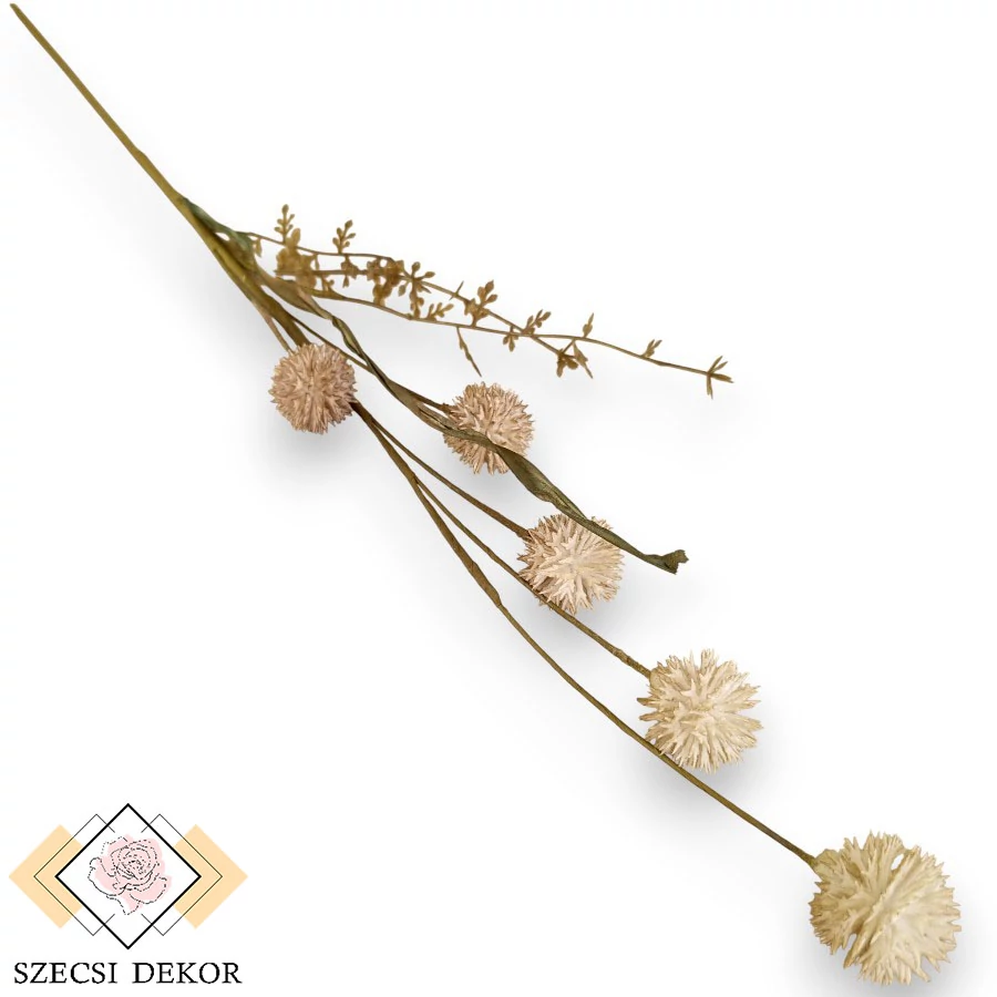 Tüskés gömb termésű, echinacea purpurea szál papír anyagú levéllel és mű zölddel. Könnyen formázható, vékony szára olajzöld krepp papírral körbetekert. Egy mellékszála tartalmazza az 1 db szálas, sötétzöld papírlevelet, és a ritkás, opálos, tüskés szélű, apró levelű mű zöldeket. A termések a fő ágról fakadnak, körkörösen helyezkednek el, merevítetlen szálakon. Öt db leszedhető, szúrós pamacsot tartalmaz. A műanyag szálak gömb formában helyezkednek el, a végük szigonyszerűen elágazik., színük átmenetes.