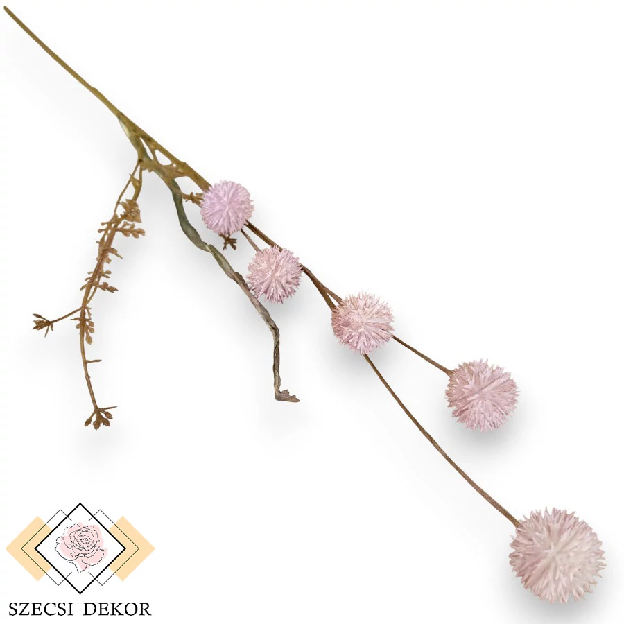 Tüskés gömb termésű, echinacea purpurea szál papír anyagú levéllel és mű zölddel. Könnyen formázható, vékony szára olajzöld krepp papírral körbetekert. Egy mellékszála tartalmazza az 1 db szálas, sötétzöld papírlevelet, és a ritkás, opálos, tüskés szélű, apró levelű mű zöldeket. A termések a fő ágról fakadnak, körkörösen helyezkednek el, merevítetlen szálakon. Öt db leszedhető, szúrós pamacsot tartalmaz. A műanyag szálak gömb formában helyezkednek el, a végük szigonyszerűen elágazik., színük átmenetes.