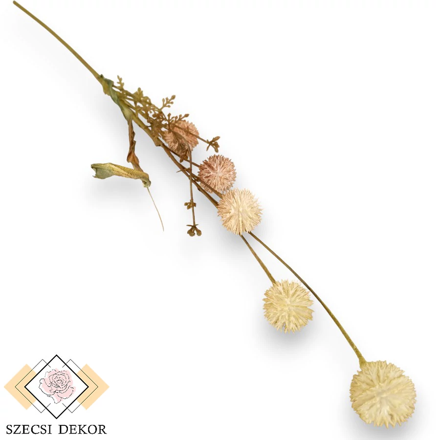 Tüskés gömb termésű, echinacea purpurea szál papír anyagú levéllel és mű zölddel. Könnyen formázható, vékony szára olajzöld krepp papírral körbetekert. Egy mellékszála tartalmazza az 1 db szálas, sötétzöld papírlevelet, és a ritkás, opálos, tüskés szélű, apró levelű mű zöldeket. A termések a fő ágról fakadnak, körkörösen helyezkednek el, merevítetlen szálakon. Öt db leszedhető, szúrós pamacsot tartalmaz. A műanyag szálak gömb formában helyezkednek el, a végük szigonyszerűen elágazik., színük átmenetes.