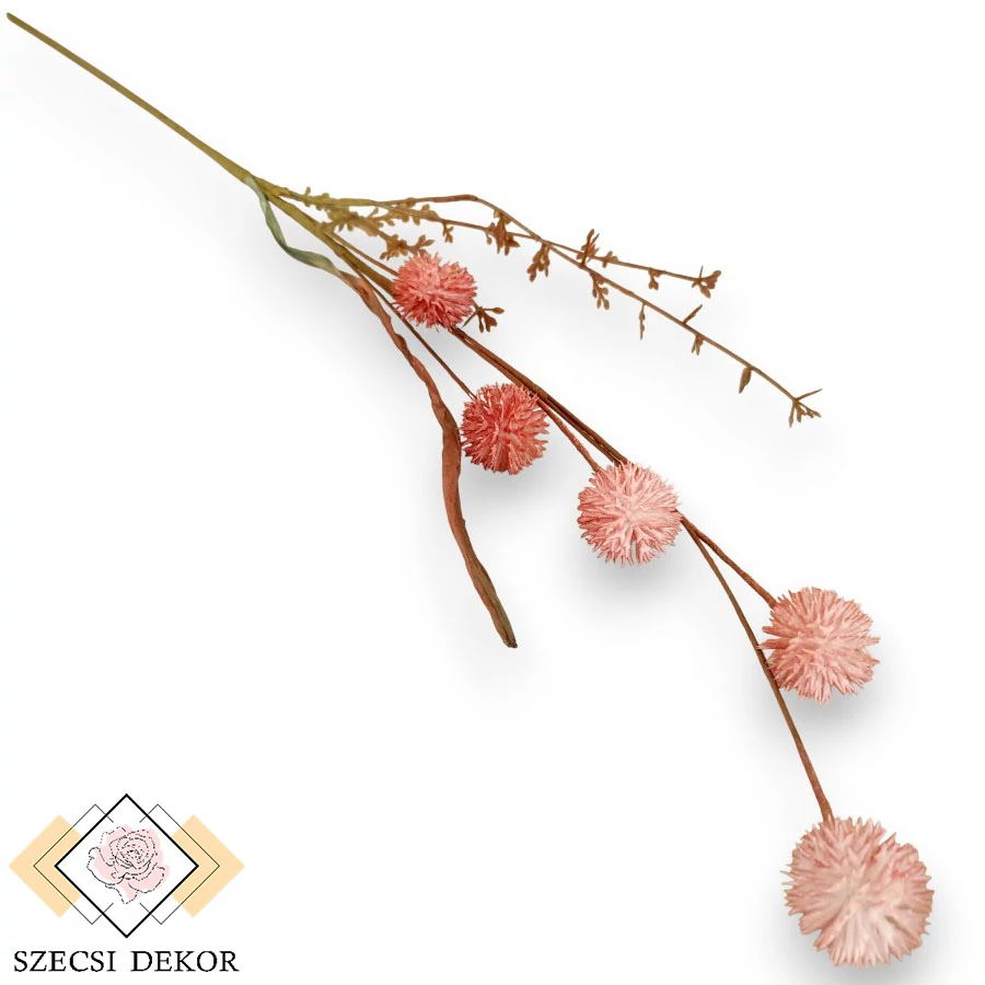 Tüskés gömb termésű, echinacea purpurea szál papír anyagú levéllel és mű zölddel. Könnyen formázható, vékony szára olajzöld krepp papírral körbetekert. Egy mellékszála tartalmazza az 1 db szálas, sötétzöld papírlevelet, és a ritkás, opálos, tüskés szélű, apró levelű mű zöldeket. A termések a fő ágról fakadnak, körkörösen helyezkednek el, merevítetlen szálakon. Öt db leszedhető, szúrós pamacsot tartalmaz. A műanyag szálak gömb formában helyezkednek el, a végük szigonyszerűen elágazik., színük átmenetes.