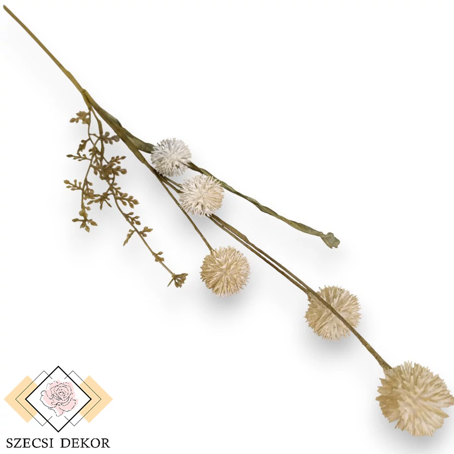 Tüskés gömb termésű, echinacea purpurea szál papír anyagú levéllel és mű zölddel. Könnyen formázható, vékony szára olajzöld krepp papírral körbetekert. Egy mellékszála tartalmazza az 1 db szálas, sötétzöld papírlevelet, és a ritkás, opálos, tüskés szélű, apró levelű mű zöldeket. A termések a fő ágról fakadnak, körkörösen helyezkednek el, merevítetlen szálakon. Öt db leszedhető, szúrós pamacsot tartalmaz. A műanyag szálak gömb formában helyezkednek el, a végük szigonyszerűen elágazik., színük átmenetes.