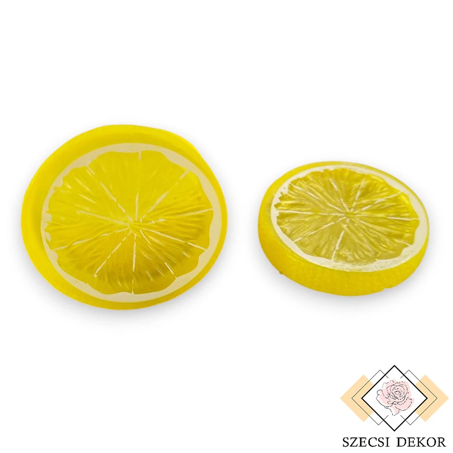 Dekorációs közepes citrom karika üreges műanyagból, élethű festéssel. Felülete kidolgozott, érdes tapintású. Festése egyenetlen, kívül élénk citromsárga, belül opálsárga, a cikkek és a burok fehér színnel festett. A szélén a héja pontokban mélyesztett, rücskös hatású, belül a gyümölcshús változatosan domborodó.