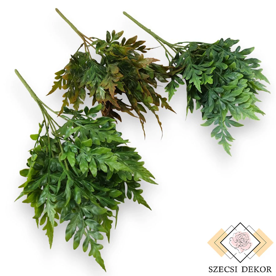 Kellemes tapintású, részletesen kidolgozott phyllocladus aspleniifolius dús csokor. Vastag sötétzöld szára pontokban sűrűn bordázott, irdalt. Szálai eltérő magasságokban válnak szét. A két alsó 4, a másik három 5 darab leszedhető tövet tartalmaz. Levelei szárnyasan, enyhén elcsúsztatva egymás fölött illetfe legfelül helyezkednek. Formáik különböznek: valamelyik 3 részből áll, van ami csak egyből. Felületük fényes, erezetük domborodó. Széleik és felületük hullámos, fényesek, színátmenetesek.
