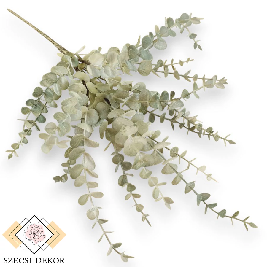 Hamvas bevonatú, közepes méretű eukaliptusz ág átmenetes, erezett levelekkel, fix tövekkel. Felfelé vastagodó szára mérsékelten formázható, barna színű, helyenként sárgára festett papírral bevont. Többszörösen elágazó, a tövek változatosan helyezkednek el. Majdnem végig merevítettek és irdaltak, a legfelül található egy 7 cm-es rugalmas rész. Levelei párosával, egymás fölött, elcsúsztatva helyezkednek el szárölelőek. Felfelé haladva méretük csökken, felületük érdes, szélük ép, némelyeknek hegyesedő. Színezete változatos, több helyen barna pöttyökkel tarkított, erezete a hátoldalán domborodó, hangsúlyos.
