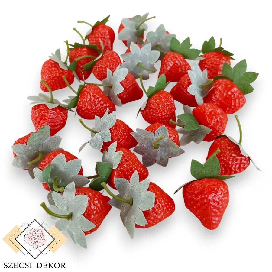 Dekorációs eper csomag üreges műanyagból, kidolgozott felülettel, levéllel és szárral, celofánban. Formája változatos, felületük eltérően rücskös, mélyedésekkel teli, érdes tapintású. Festése egyenletes, az oldalán forrasztott, jellegzetes formájú a gyümölcs. Tetején virág alakú, durva szövésű, selyem anyagból készült matt levél illetve műanyag merevítetlen száracska található. Méretük nagyjából azonos.