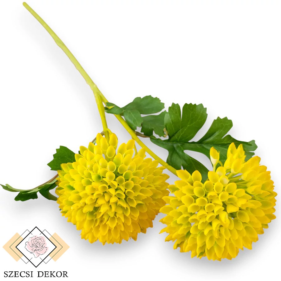 Duplafejű, félgömb alakú gömb dália fej műanyag, tölcséres szirmokkal, selyem levelekkel. Vastagabb, világoszöld színű merevített szára sűrűn irdalt, sima felületű. Kétfelé ágazik, mindkettőhöz tartozik 1 db bimbó és 1 db leveles tő. Szeldelt, tenyeresen hasadt, háromágú, levelei fűrészes szélűek. Színük erőteljes zöld, erezetük világosabb színnel, részletesen festett. Barázdált, rombusz alakú bimbói tömör műanyagból készültek. Fejei tömöttek, félgömb alakúak, porzót nem tartalmaznak. Alulról ár alakú, tüskés, nyurga végű, dombornyomott csészelevelek ölelik. Szirmai ferdén metszett tölcsér alakúak, a virág közepe felé néznek, körkörösen helyezkednek el.
