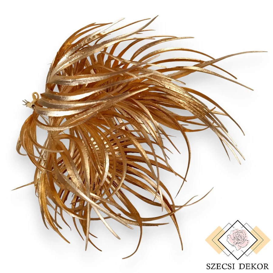Metál festésű legyezőpálma köteg nagyobb méretű, fix levelekkel, raffiával összekötve. Vékony szára a festett merevítés, alul szürke színű, felül pedig aranyozott. A szálak végig merevítettek, mindegyik 1 darab levelet tartalmaz, amik a szálak tetején helyezkednek el. Levelei összetettek mélyen hasadtak, félkörívesen helyezkednek el. Keskenyek, szálas jellegűek, erőteljesen öblösek, végük hegyes, görbe. Felületük érdes, szélük ép.