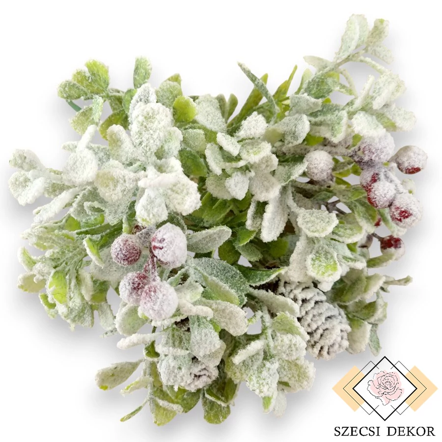 Dús, szerteágazó tövekkel rendelkező, havas helichrysum csokor tobozzal és bogyókkal. Forrasztott, sötétzöld szára nagyon vékony, erőteljesen barázdált, irdalt. A középső kivételével (az csak kettőt) mindegyik szál tartalmaz 2 db leveles tövet. Ezek merevítetlen, hosszú szárral rendelkeznek, színük felfelé világosodik. Leveleinek mérete felfelé csökken, hármasával, egymás fölött fedésben helyezkednek el. Alakjuk elliptikus (felül kerekebbek), erezetük dombornyomott Három tőnek a tetején fürtösen, vörös színű, hungarocell bogyók találhatóak, vastag, fényes festékréteggel ellátva. A maradék 2 szál végét műanyag, nyújtott tobozok foglalják el. Színük világosabb barna árnyalatú, pikkelyeinek teteje fodros, enyhén dombornyomottak. Méretük nagyjából azonos, a felső pár réteg csökkenő, illetve sűrűbben is helyezkednek el. A dekor puha, vattaszerű műhóval borított.