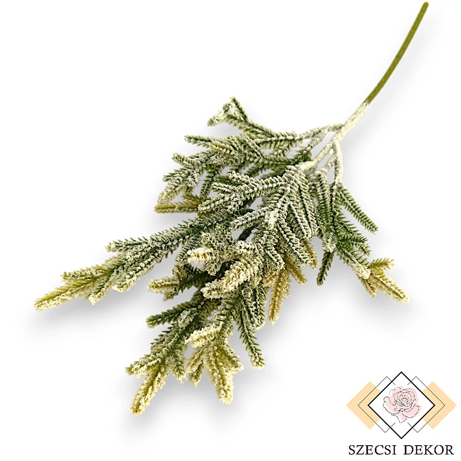 Kisméretű, dús, rövid tűlevelekkel rendelkező szobafenyő szál műhó borítással. Merevített, vékony szára könnyen formázható, erősen barázdált, irdalt. kevés helyen ágazik el, azok is rövidek. Leszedhető tövei merevítetlenek, többszörösen elágazóak, a csúcsokon világosabb színűek. Tűlevelei rövidek, nagyjából azonos méretűek, szabályosan helyezkednek el. Erősen felfelé állnak, végük hegyes, körben helyezkednek el.